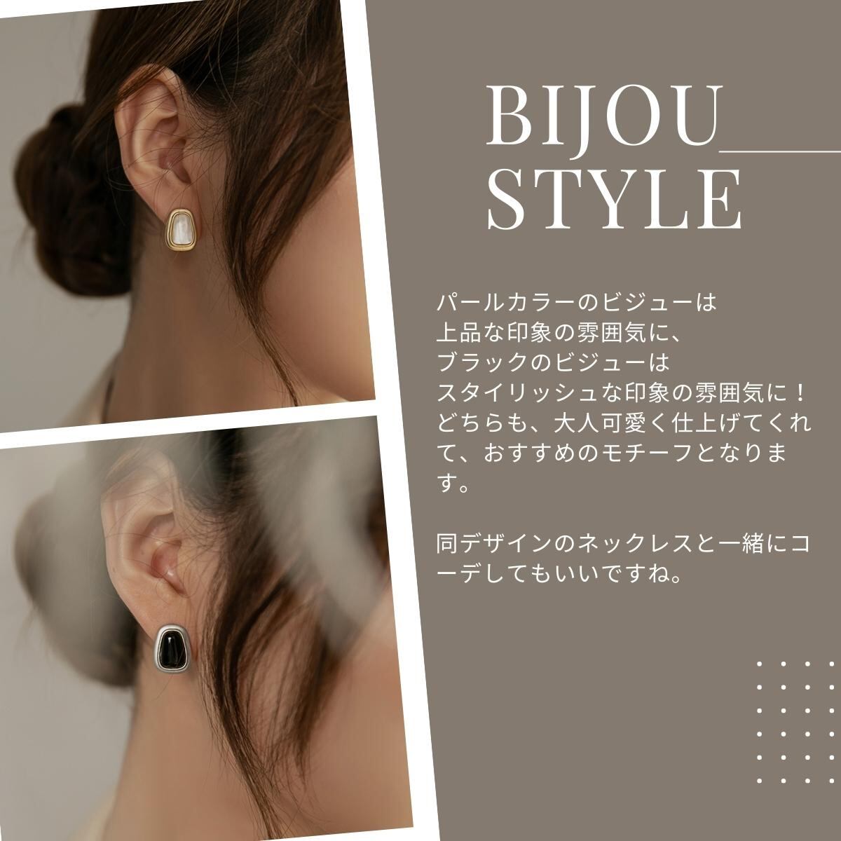 特徴:ネックレスとお揃いで パールカラーのビジューは上品な印象の雰囲気に、ブラックのビジューはスタイリッシュな印象の雰囲気に!どちらも、大人可愛く仕上げてくれて、おすすめのモチーフとなります。同デザインのネックレスと一緒にコーデしてもいいですね。