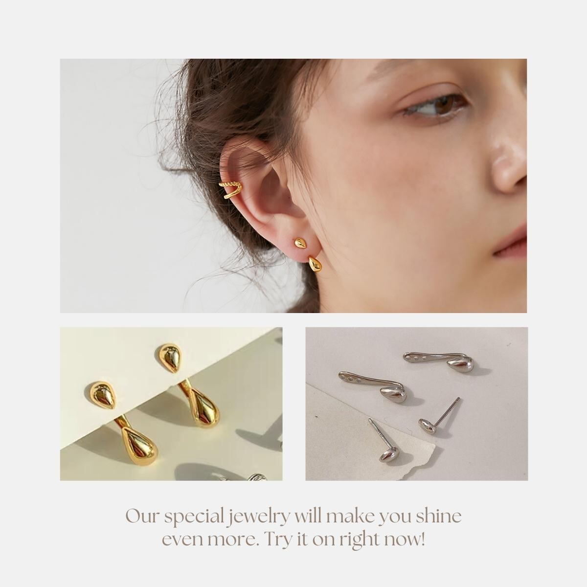 特徴:雫(しずく)耳たぶから滴り落ちる雫のようなデザインピアス。3つの穴があるので、耳たぶのサイズに合わせた微調整が可能。