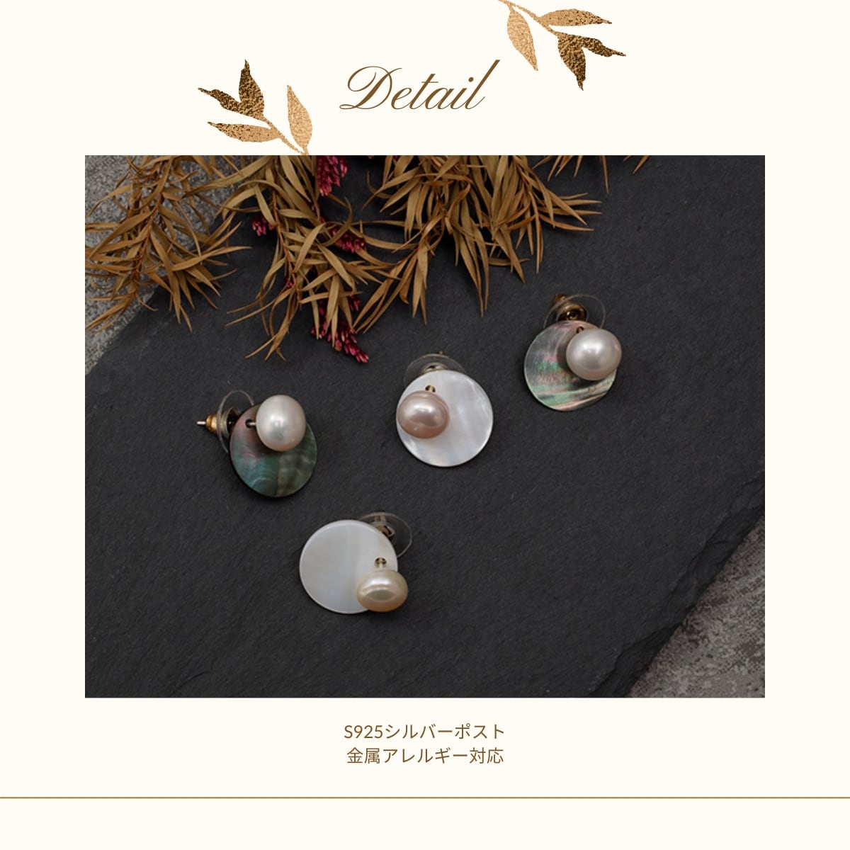 特徴:表情豊かなシェルの光沢感♪シェルの光沢感が上品なカジュアルスタイルを叶えます!パールとシェルが耳を挟み込むような小技の効いたモダンなデザインです♪