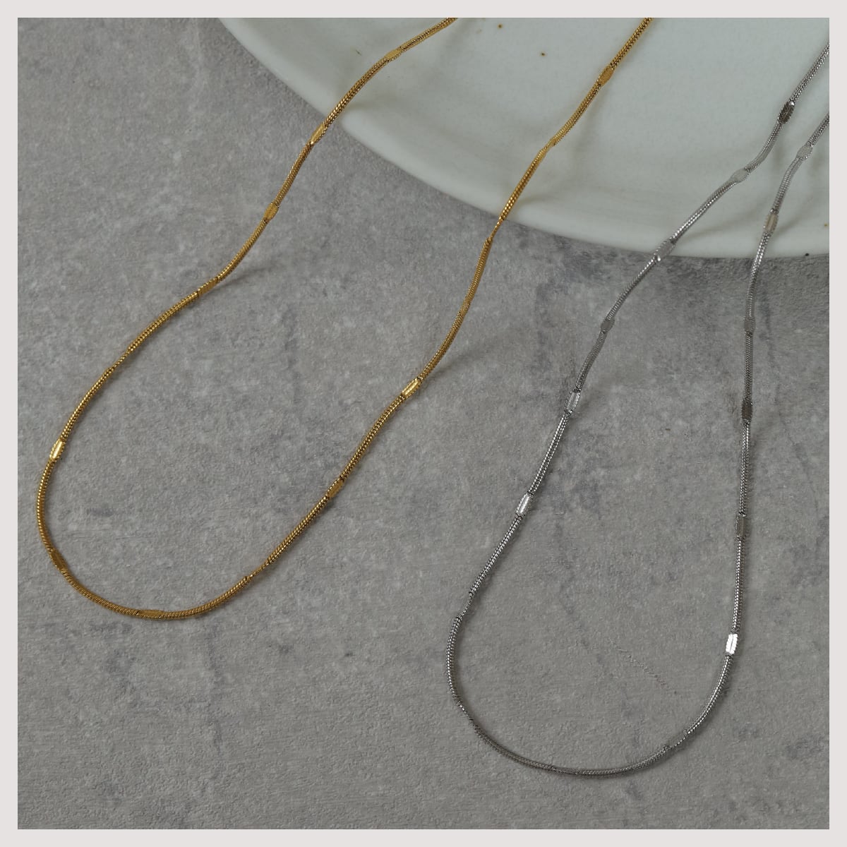 特徴:シンプルなデザインでありながら、洗練された輝きを持つチェーンネックレス。高品質なサージカルステンレス製で、18Kゴールドコーティングが上品な光沢を引き立てます。身につける人のスタイルをシンプルに魅了する一品です。
