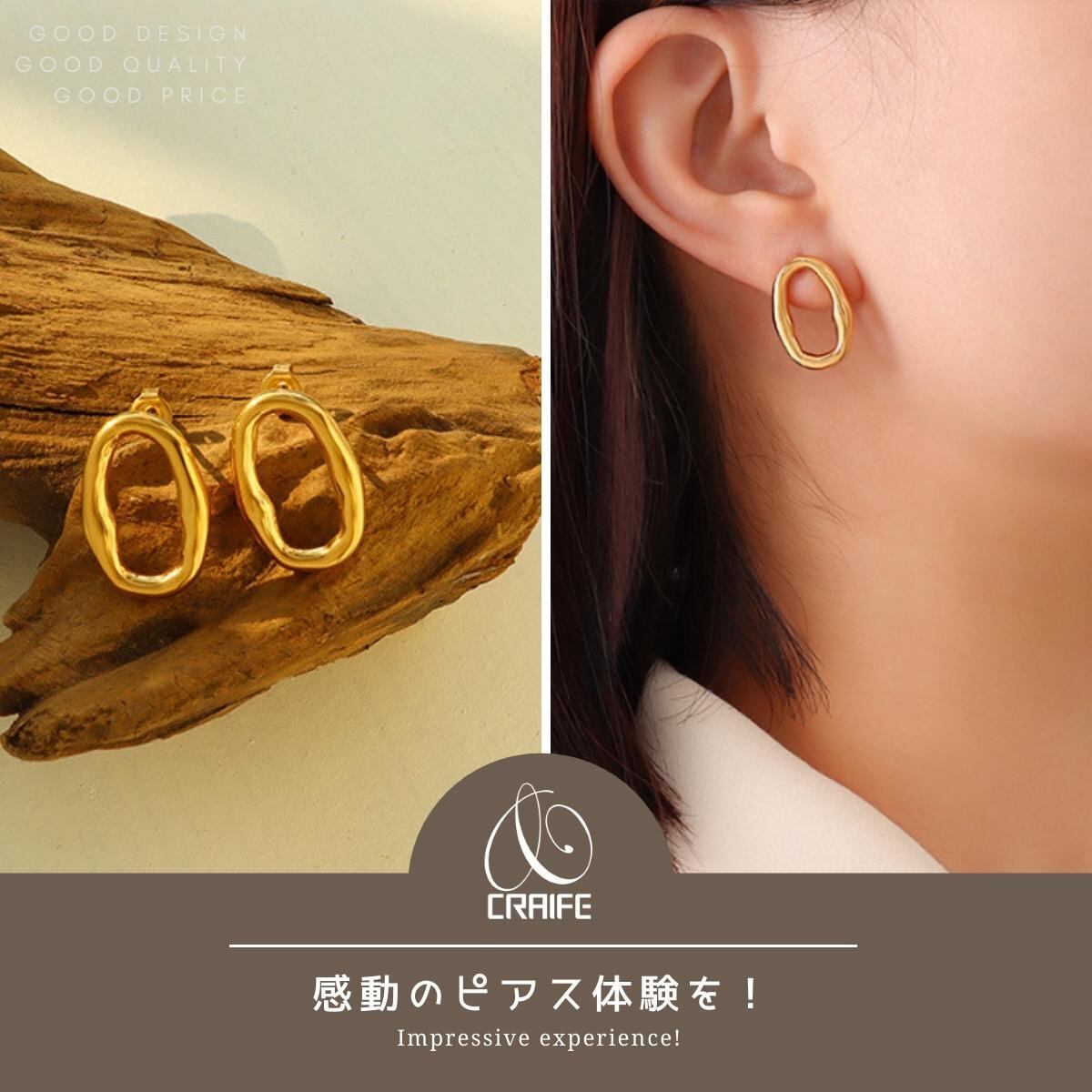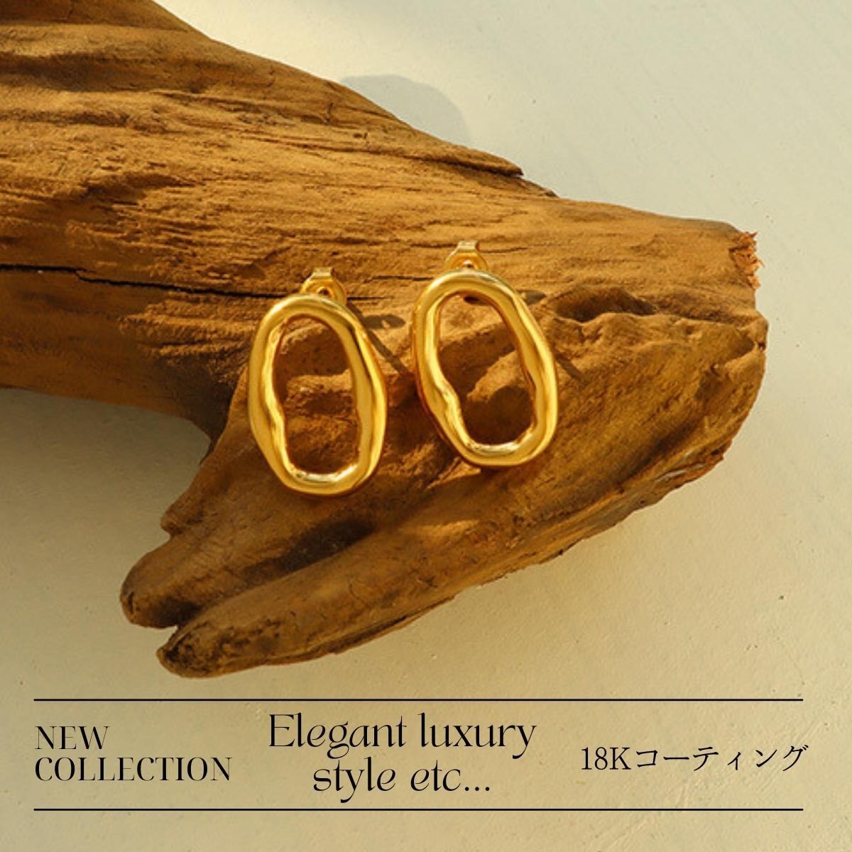 オーバル型のデザイン。フープ風スタイルで、おしゃれ!同デザインのネックレスと一緒にコーデしてもいいですね。